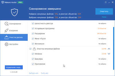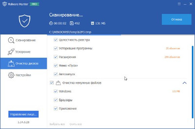 Кроме защиты, Malware Hunter PRO умеет проводить оптимизацию системы, для того, чтобы она работала быстрее. Так же в программе доступен инструмент очистки дисков от мусора.